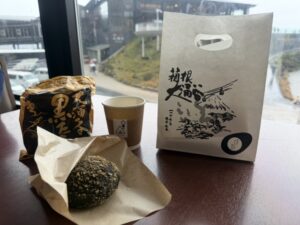 大涌谷ではいつも「黒たまご館」の中の「涌わくキッチン」で買った黒たまごを持ち込み、カフェラテとカレーパンを食べるのが我が家の流儀。